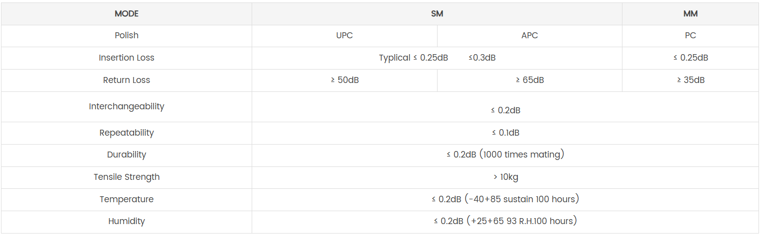 • Repeat plug: < 0.25 dB, each 500 times plug