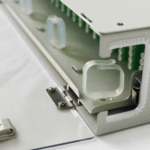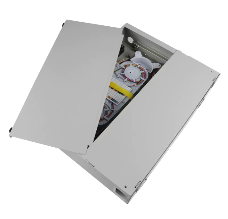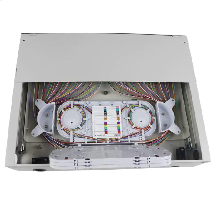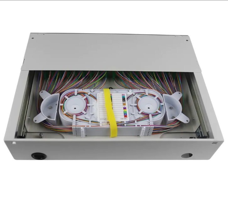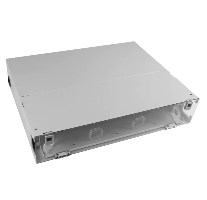 19’’ rack-mounted fiber optic patch panel that is made of cold roll steel, with plastic splice tray inside, suitable for pigtail, ribbon, and bunch cable distribution. And it has metal sliding fittings with self-locking functions that prevent the drawer from falling when moved.